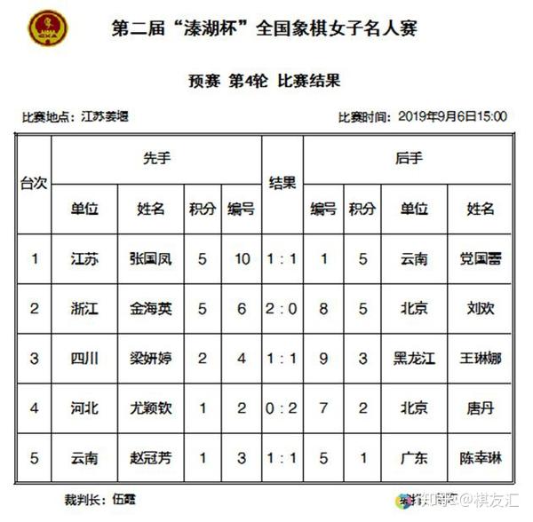 中国智力运动网讯 9月6日下午,第二届“溱湖杯”全国象棋女子名人赛预赛第4轮在溱湖开元名庭酒店战罢,金海英击败刘欢,积7分傲视群芳已经确保半决赛席位,积6分的张国凤和党国蕾也基本确定入围4强。