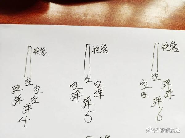 如果连续放入两颗子弹,先开枪的人成为赢家的概率是三分之一;如果连续放入四颗子弹,先开枪的人成为赢家的概率是六分之一;如果连续放入五颗子弹,先开枪的人成为赢家的概率是六分之一。